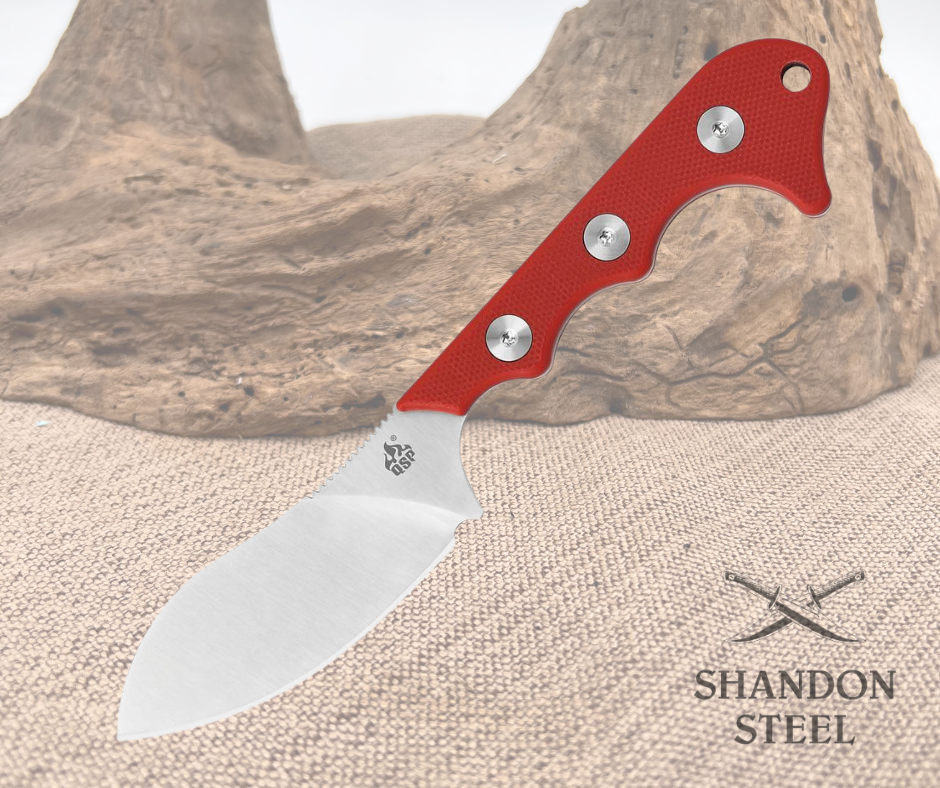 6.5" (16.51cm) overall. 2.88" (7.32cm) satin finish D2 tool steel blade. Red G10 handle. Full tang. Lanyard hole. Ball chain lanyard. Designed by Arthur Brehm. Black Kydex neck sheath. Boxed.