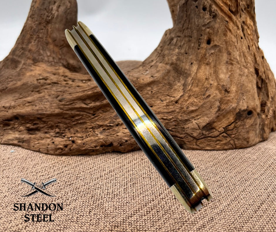 The Queen Cutlery Gamekeeper Series Model 309 3 Blade Folding Stockman Knife is a high-quality pocketknife with a black color and ambidextrous dexterity. Made in the United States, this original piece features a clip point, sheepsfoot, and spey point blade under 2.75 inches in length. The manual opening mechanism and slipjoint lock type make it a reliable tool for everyday use. With three blades and a durable construction, this pocketknife is a must-have for collectors and outdoor enthusiasts alike. Measures 4" closed, good snap, no wobble, minimal scuffs.