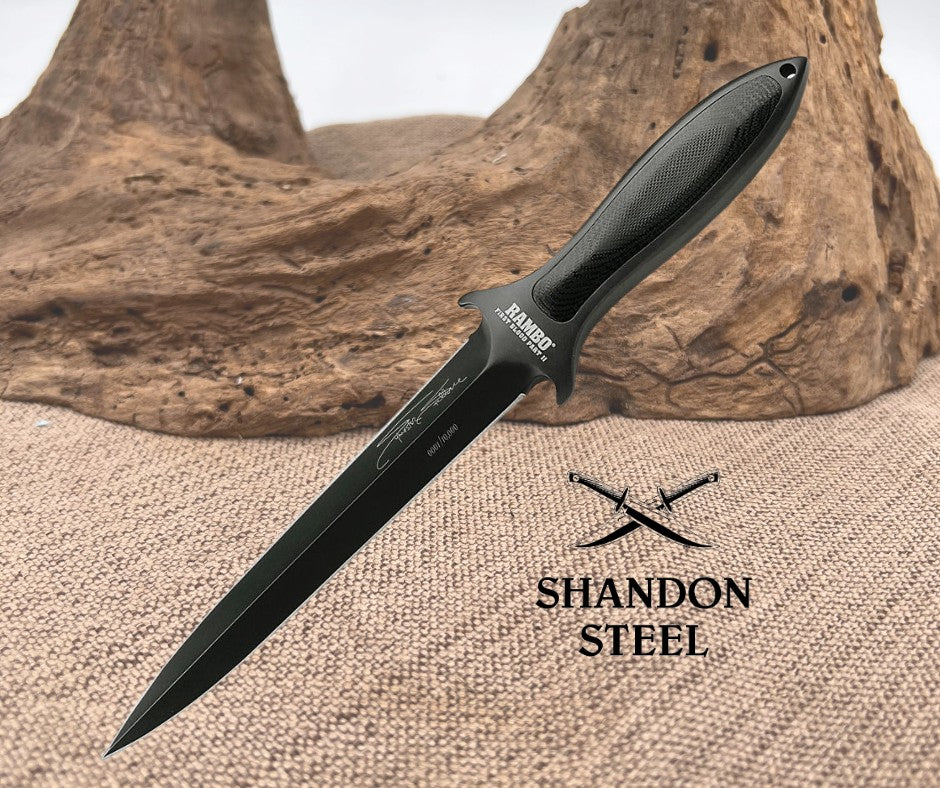 10.83" (27.51cm) overall. 6.13" (15.57cm) black finish stainless blade. Lanyard hole. Authentic reproduction of the knife used by Sylvester Stalone in Rambo: First Blood Part II. One piece inter-frame design with micarta inlay. Serialized limited edition of 10,000. Black leather belt sheath. Boxed.