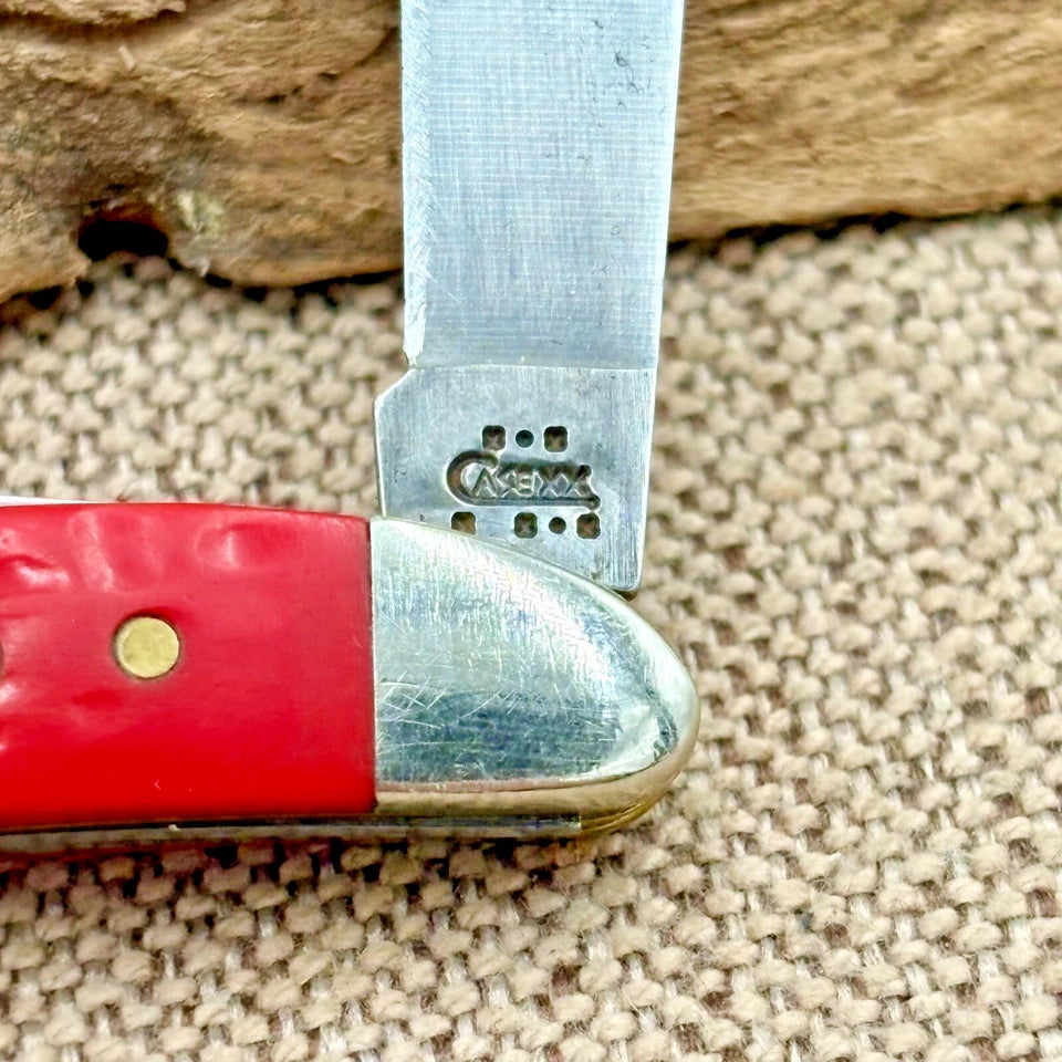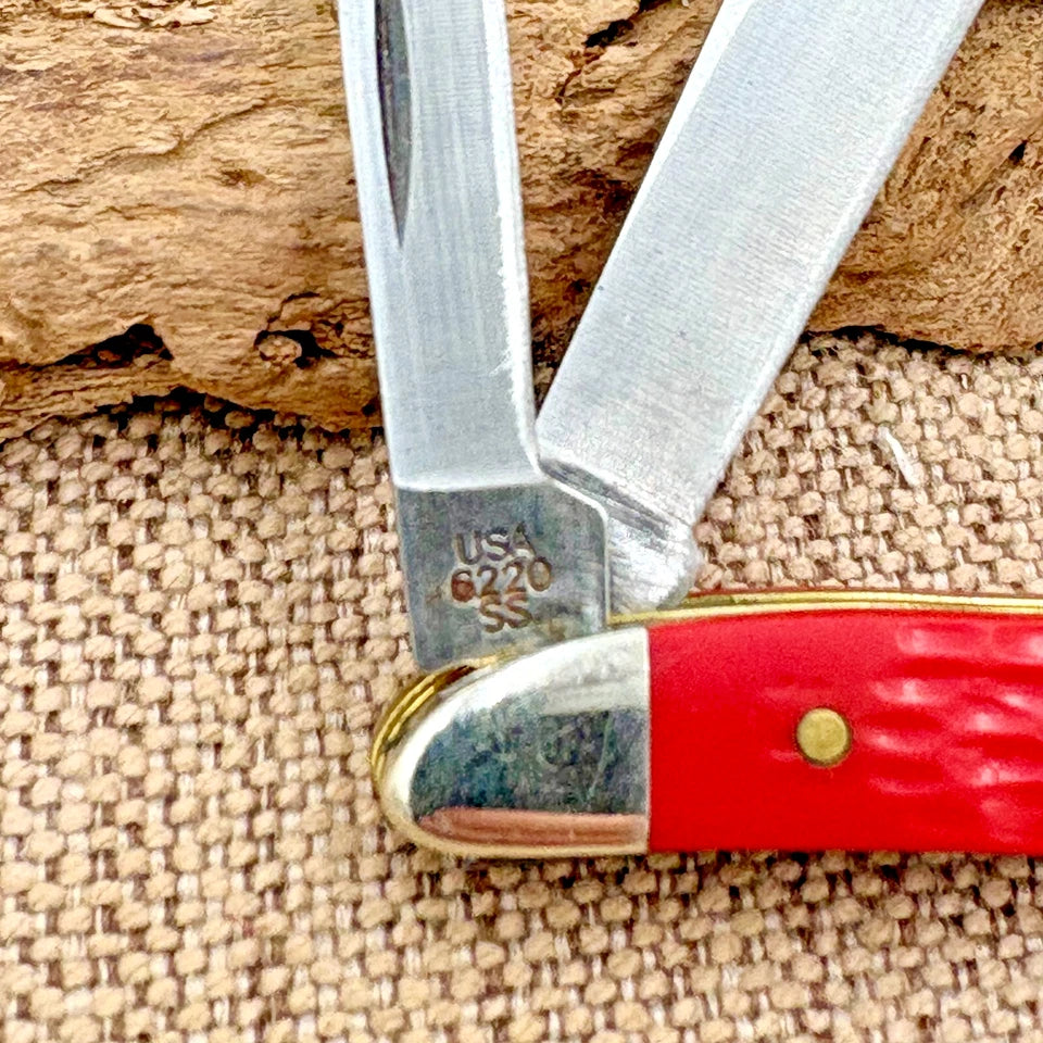 The Case XX 6220 SS Red Bone Peanut Folding Pocket Knife is a rare and collectible piece made in the USA. Featuring a stainless steel blade with a clip point and a slipjoint lock type, this ambidextrous pocketknife has a 1-1/2" - 2" blade range. The red bone handle and manual opening mechanism add to its charm, making it a valuable addition to any knife collection. With only 2 blades and a collectible design from 2003, the Case XX 6220 SS Peanut is sure to be a prized possession for any knife enthusiast.