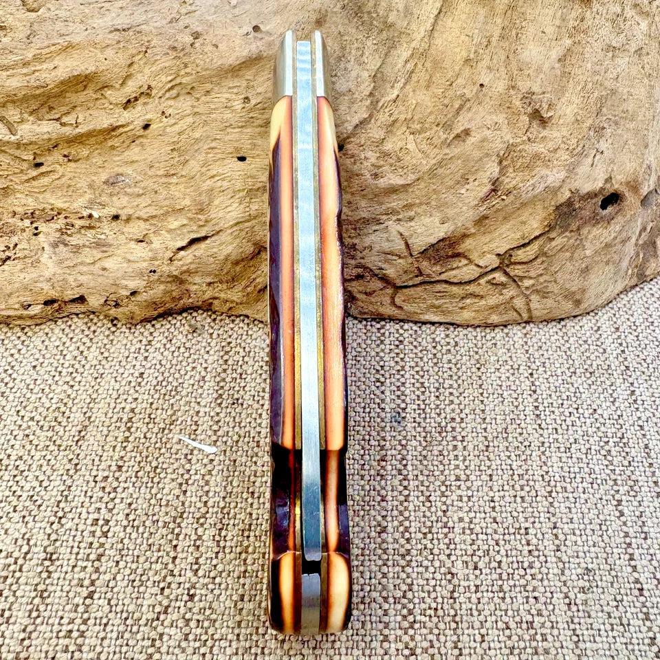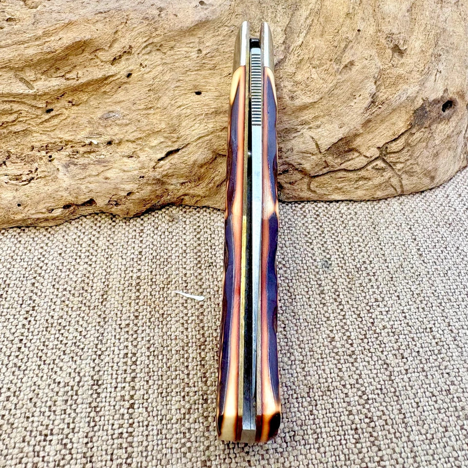 The Remington UMC USA Delrin Jumbo Bullet Trapper Knife from 1990 is a vintage collectible folding knife with a 2.76 - 4 inch stainless steel blade featuring a drop point design. This ambidextrous pocketknife has a manual opening mechanism and a lockback design, making it safe and convenient to use. The handle is made of plastic and the knife is multi-colored, adding to its appeal for collectors. This original Remington knife, made in the United States, is a unique addition to any knife collection. Measures 4.5" closed.