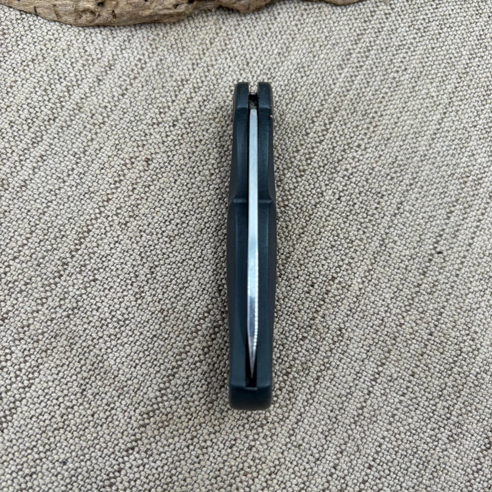 The Remington USA Racing Lockback Drop Point Folding Pocket Knife features a 2.25" stainless steel blade with a plain edge, housed in a black plastic handle. This manual pocketknife has a lockback mechanism for secure use and is designed for ambidextrous use. Made in the United States, it is an original Remington model ideal for collectors or everyday use. Measures 3-5/8" closed.