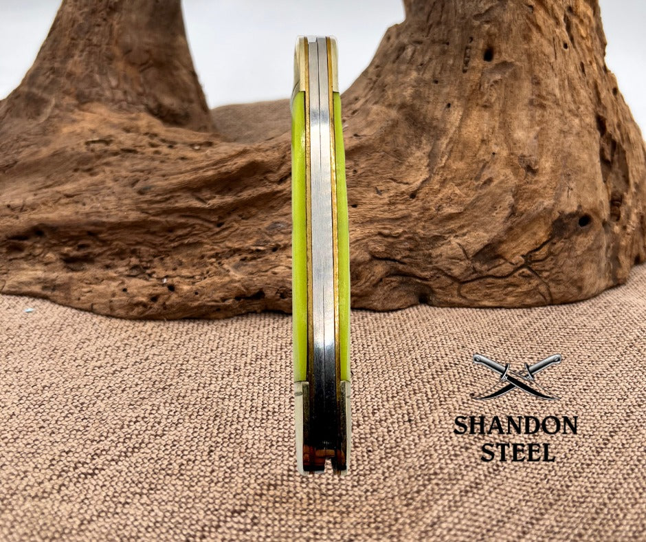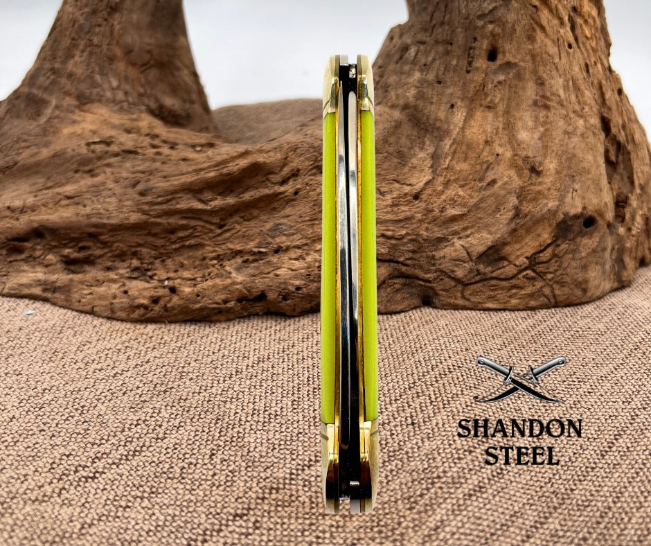 The Rough Rider Canoe RR1514 Moon Glow pocket knife features a stainless steel blade with a glow-in-the-dark handle, making it both functional and stylish. This ambidextrous pocketknife has a manual opening mechanism and a sleek yellow color, perfect for collectors or everyday use. With a pen blade type and slipjoint lock type, this original Rough Rider model is a must-have for any knife enthusiast looking to add a unique piece to their collection. Measures 3-5/8" closed.