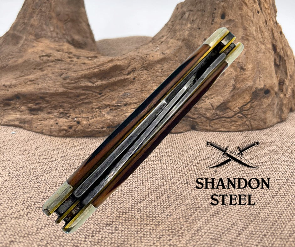 The Schrade Old Timer 34OT Stockman Vintage Folding Pocket Knife is a collectible folding knife made in the USA. It features a carbon steel blade with a clip point and plain edge, measuring under 2.75 inches in length. The knife is ambidextrous with a manual opening mechanism and a slipjoint lock type. The handle is made of DELRIN material in a brown color, adding to its vintage appeal. This original Schrade knife includes three blades and is a must-have for collectors of vintage folding knives. Measures 3-3/8" closed.