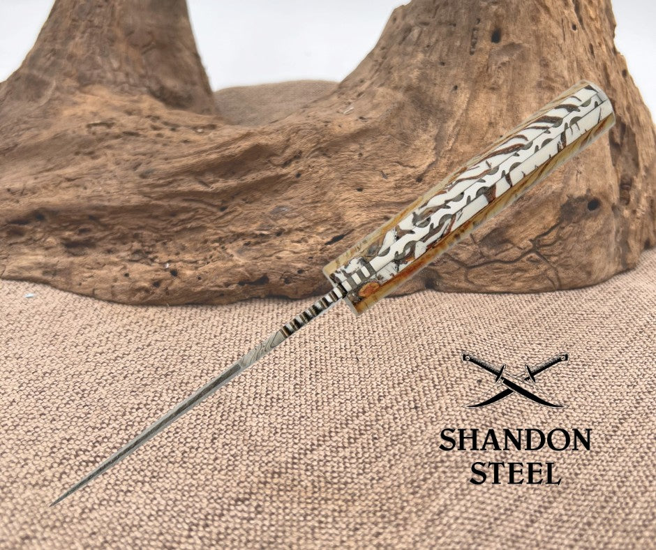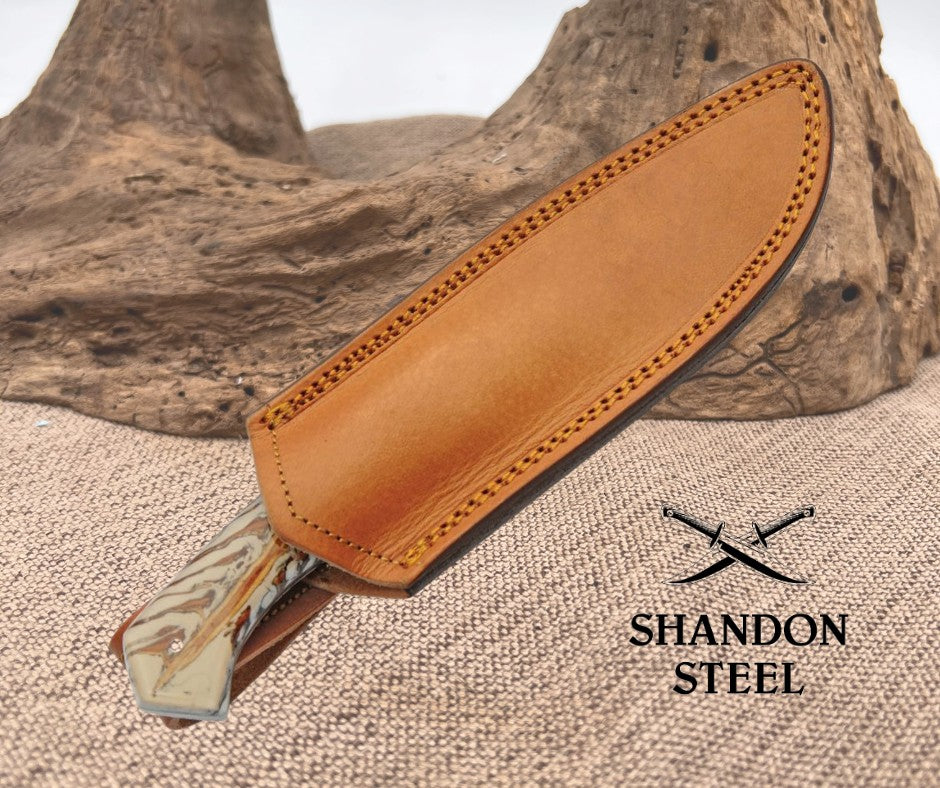 Crafted for precision and durability, the Damascus Snowpeak Hunter Fixed Knife features a 5" drop point blade made from high-quality Damascus steel. This full tang construction ensures that the blade is impeccably balanced, providing both resilience and strength for any task at hand. Its sharp, plain edge is designed for cutting efficiency. The knife boasts an ergonomic acrylic handle, offering a comfortable grip that is both sleek and sturdy. This hunting knife is designed for ambidextrous use and comes with a protective sheath to safeguard the blade when not in use. The craftsmanship is original, with no modifications, and it proudly originates from Pakistan.