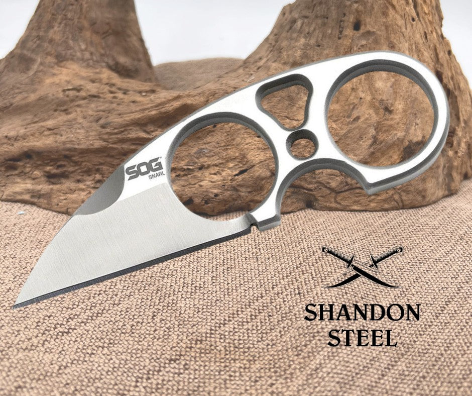 The SOG SNARL Fixed Blade Stainless Satin Finish Handle Knife is a versatile and durable tool suitable for everyday carry, combat, and survival purposes. With a 2-3 inch stainless steel blade featuring a sheepsfoot design, this knife offers precision and reliability. The full tang construction ensures strength and stability, while the ambidextrous design allows for use by both left and right-handed individuals. The sleek silver blade color and stainless steel handle with a satin finish add to the knife's modern and collectible appeal. The knife comes with a black sheath for safe storage and transportation, making it a practical and stylish addition to any collection. 4 1/4" overall. 2 1/4" sheepsfoot blade. One piece satin finish 9Cr13MoV stainless construction with finger choil. Hardened to 58-60 HRC. Oversized finger hole and ring pommel. Lanyard hole. Black molded Kydex sheath with black stainless clip. Black stainless ball chain. Hang packaged. A Jason Brous and SOG collaboration.