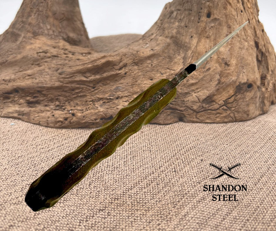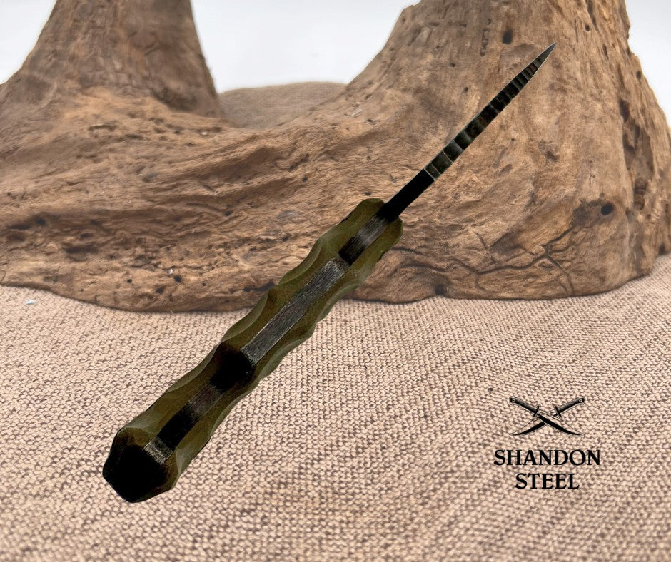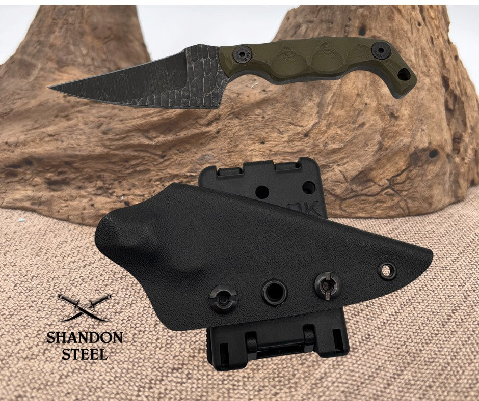 6.75" (17.15cm) overall. 3" (7.62cm) black stonewash finish 1095HC steel blade. OD green sculpted G10 handle. Full tang. Lanyard hole. Black Kydex belt sheath. Boxed.