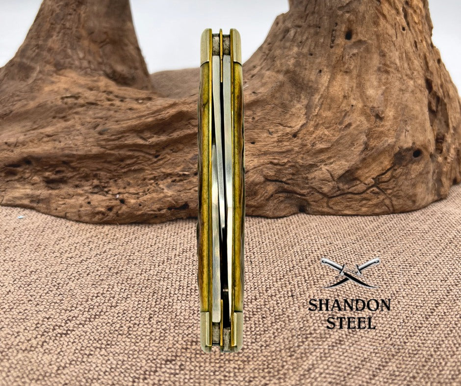 The Parker Frost USA Vintage 1978 Three Blade Stockman Stag Folding Pocket Knife is a collectible knife made in the United States. It features stainless steel blades with a clip point, measuring under 2.75 inches when fully extended. The ambidextrous pocketknife has a manual opening mechanism and a slipjoint lock type. The handle is made of stag/antler material in a brown color, adding to the vintage appeal of the knife. As an original piece from 1978, this three-blade Stockman knife is a valuable addition to any knife collection. Measures 3-7/8" closed.