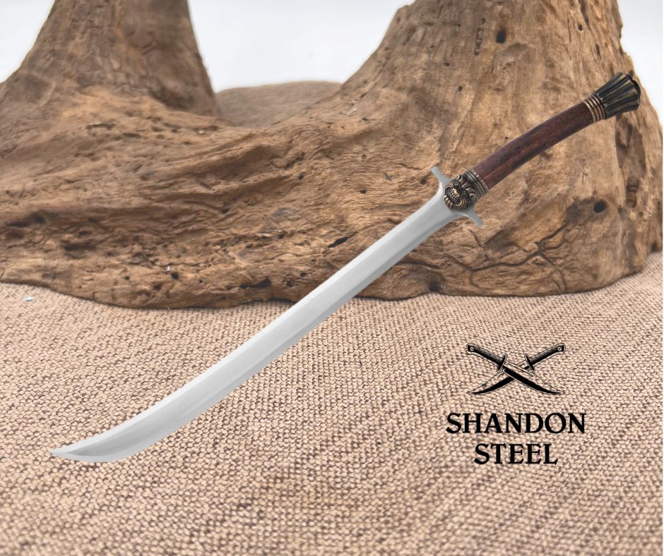 37.24" (94.59cm) overall. 25.75" (65.41cm) hand forged high carbon stainless curved blade. Brown wood handle. Cast metal guard and pommel. Certificate of Authenticity. Exact replica used in the movie "Conan the Barbarian". Officially licensed product.