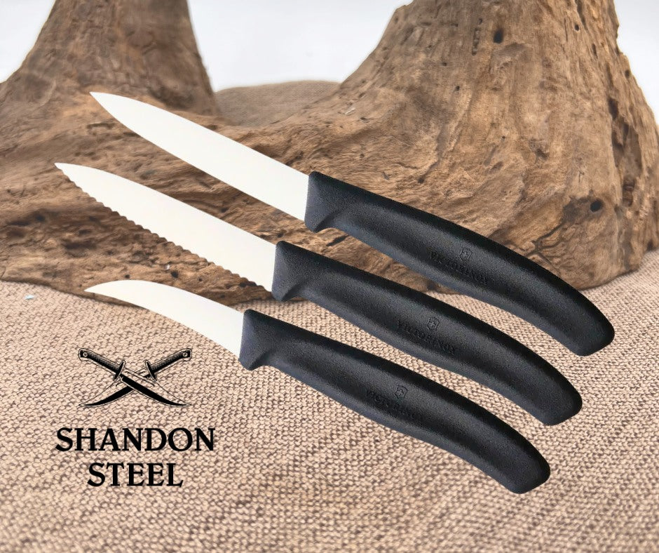Satin finish high carbon stainless blade. Black synthetic handle. Dishwasher safe. Includes: Paring with 3.5" standard edge blade; Paring with 3.5" serrated blade; Paring with 2.13" curved blade.