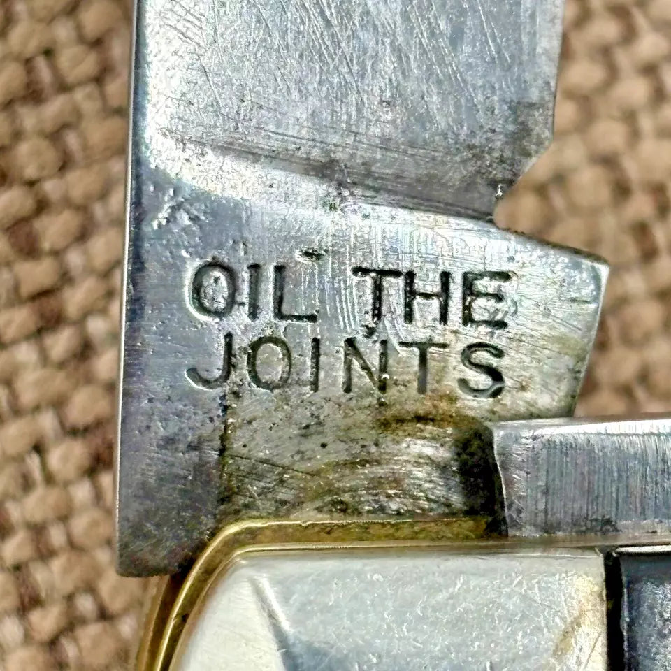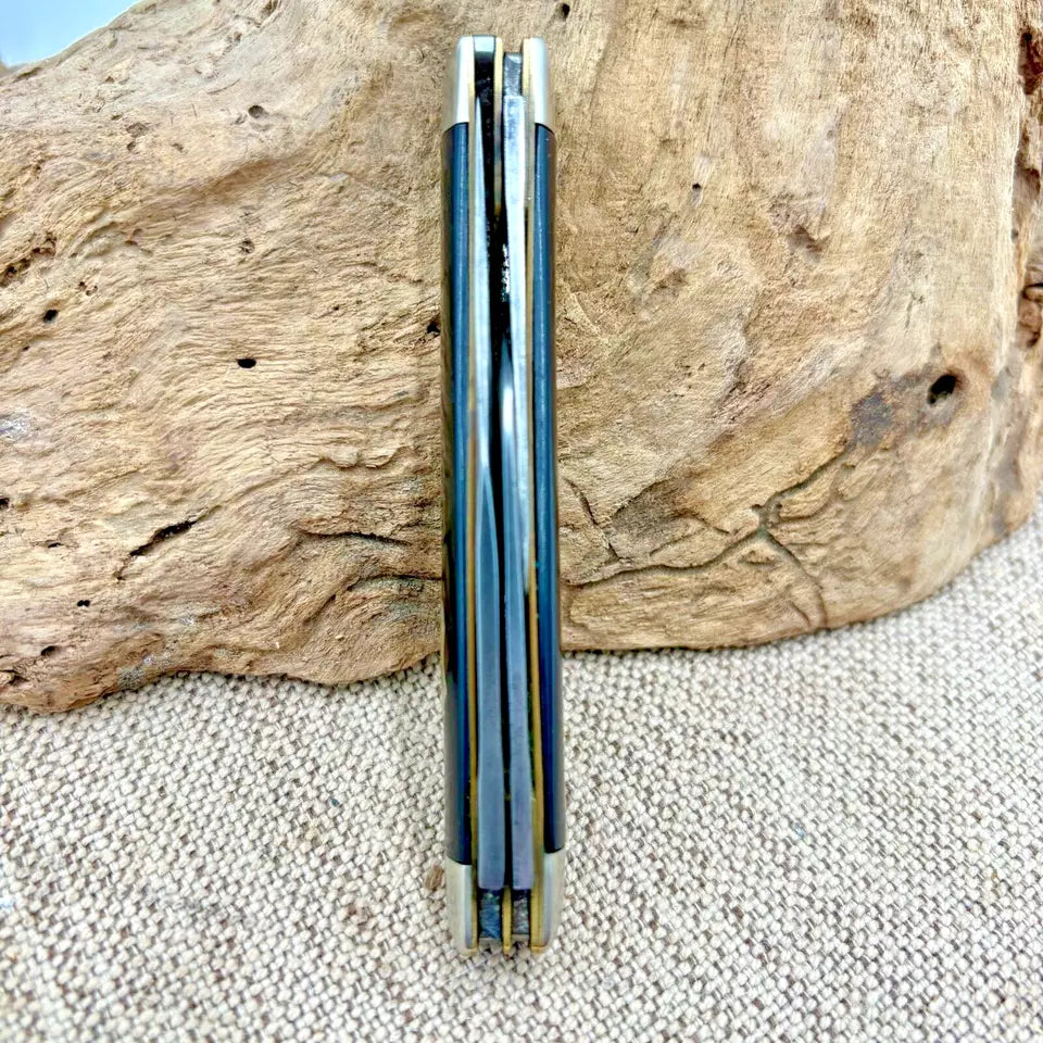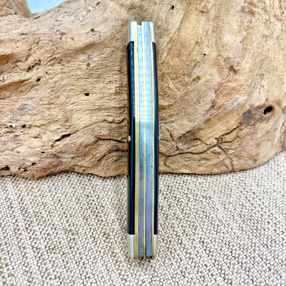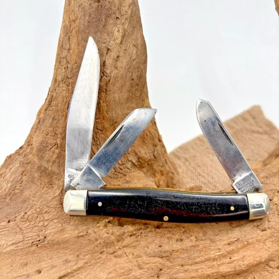 Crafted with precision and care, the Vintage IXL George Wostenholm Sheffield Stockman Knife is a testament to fine knife making. With its smooth black plastic handles, this pocketknife provides a comfortable grip, ensuring usage is as practical as it is pleasing. The knife features a robust carbon steel blade, offering durability and a classic feel. The ambidextrous design accommodates all users with its manual opening mechanism, while the slipjoint lock ensures safety during use. Its three blades, in clip point, sheepsfoot, and spey point styles, provide a variety of cutting options, making this original piece from the United Kingdom a valuable addition to any collection or a reliable tool for everyday use. Measures 4" closed, scuffs on blade, good snap.