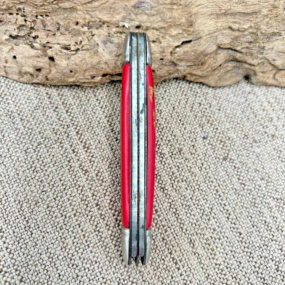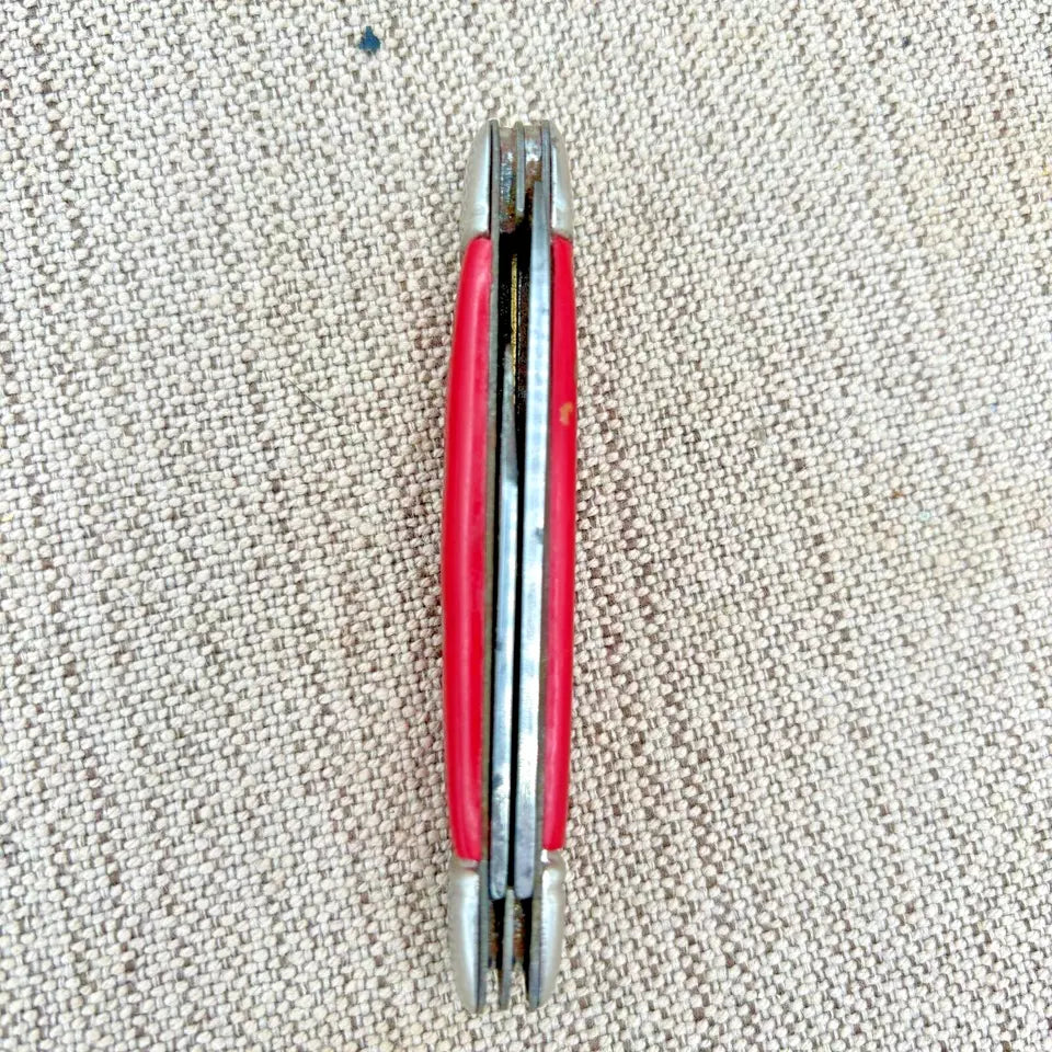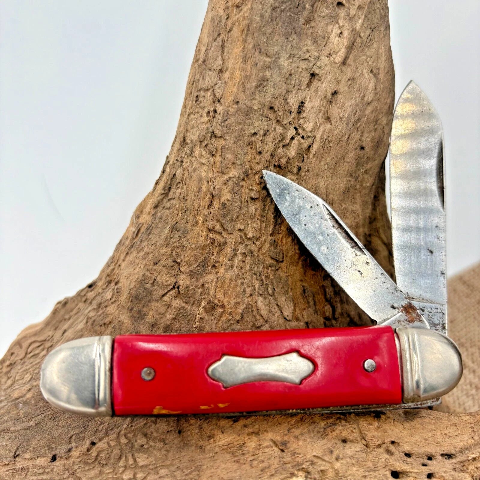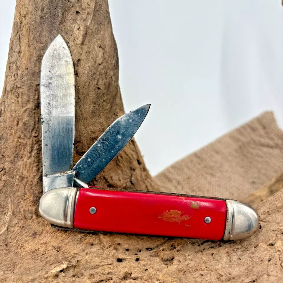 Crafted with precision and care, the Vintage USA The IDEAL 2 Blade Folding Pocket Knife is a true representation of classic utility and design. With its vibrant red plastic handle and carbon steel blades, this knife exemplifies the quality craftsmanship of the United States. The knife features a manual opening mechanism and a slipjoint lock type, ensuring safety and reliability for everyday carry or collection purposes. The IDEAL pocket knife has a blade range of under 2.75 inches, making it compact and easy to handle. With two blades, both plain edge and pen type, it offers versatility for a variety of cutting tasks. Its ambidextrous design accommodates all users, while the original vintage status adds a layer of charm and historical value. This pocket knife is an ideal find for enthusiasts and collectors alike. Measures 3.5" closed, knife is stiff, some carbon spots, need cleaned.